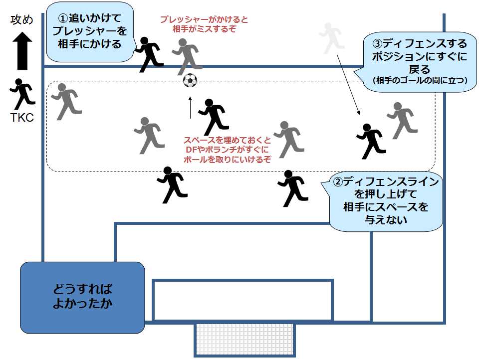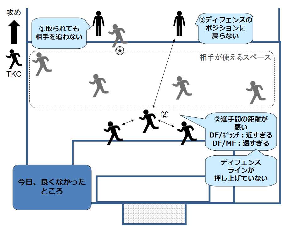 ②味方同士の距離が近すぎても、遠すぎてもスペースを相手に与えるのでいつも首を振ってポジションを修正する(気づいたら味方に声をかける、ディフェンスラインを押し上げる)