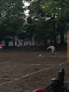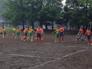 たちばなキックオフでスタート、なんと、セキヤが落としたボールを、ウラサキ→クリタ→ヤマザキと綺麗に展開、おー、上手くなってるなー、それをヤマザキが、前線のウラカワにフィード。そこはつながらなかったけど、なんかかっこいいスタート。