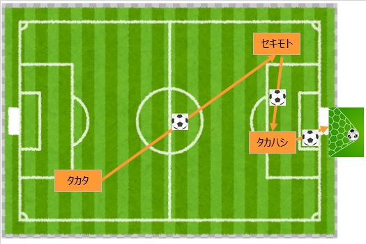 タカタからセキモトへロングフィード、セキモトがサイドを走り(いい感じの飛び出し)、ボールをもらい、そこから左足でセンターリング、そこに、いい所にキッチリ走っていたタカハシがズドン。イメージ↓