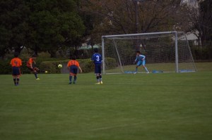 お、セキモト、タカタにナイス展開だ。タカタは前に切り込んで、あーーーーー、倒される。PKゲット。キッカーは、もちろん、キャプテンタカタ、助走して、シューーーーーーーーーーーートーーーーーーーーーーーー、あれ???????? ゴールポストの上に。。。。。。。。。。イメージ↓