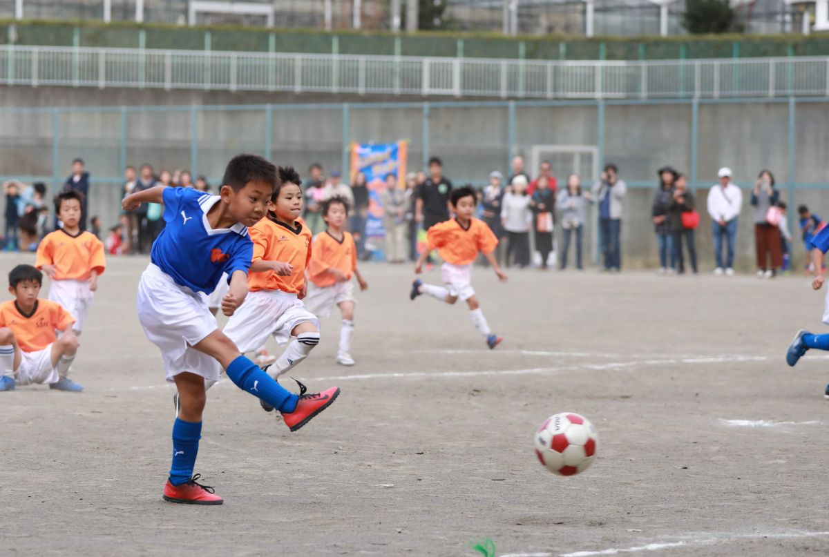 キーパーに長身のソラ。DFにルイ、ヨウイチ、他はガンガン攻めるフォーメーションで、タッチラインは下田小グランドと同じくらいだけどゴールラインが長くて、いつもより広めのグランドを全員で攻めたり守ったり、どちらかと言えばたちばながボールを支配する場面が多く、相手陣内にいるんだけど、なかなかシュートで終われない。相手もドリブル主体で全員でボールを運んでたちばなゴールに迫って来るが、DF二人とGKソラが頑張って守ってくれてる。前半は拮抗したゲーム内容で終わるのかな~と思っていたら、自陣ペナルティエリア前で相手ボールを奪った後、選手間のボールにお見合いしてしまった隙を相手FWに奪われて失点。GKソラも前に出てたけど相手が上手だったね。残念。