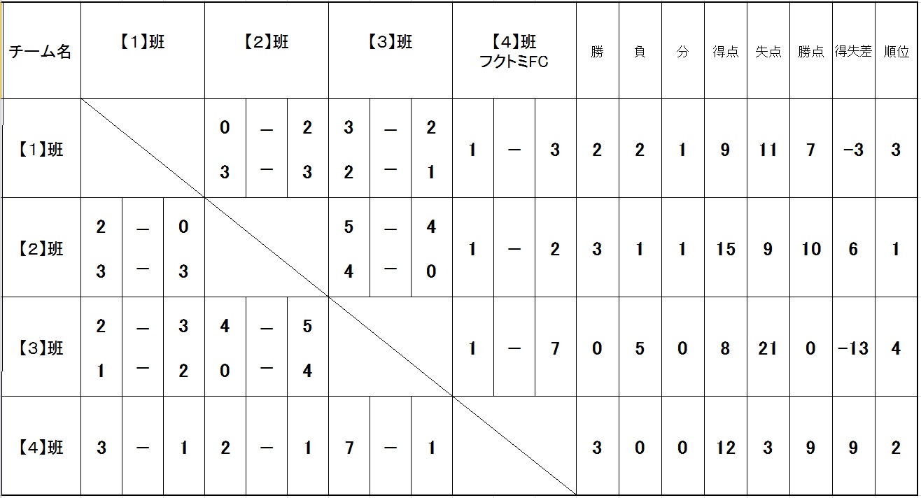 午前 1班~3班の対戦:10分ハーフ(ハーフタイム無し)、4班(コーチチーム)との対戦 :10分1本