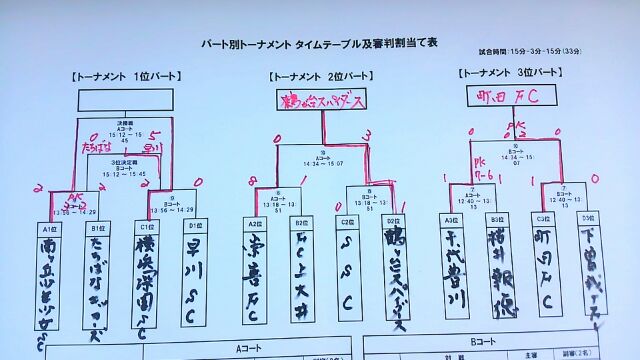 8人制15分-3分-15分(3チームごとの4ブロックリーグ)パート別トーナメント
