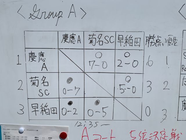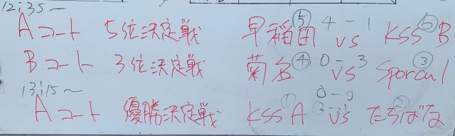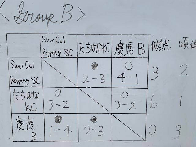 午前中、グループA(慶応A、菊名SC、早稲田)、グループB(Sporcul Roppongi、たちばなKC、慶応B)のリーグ戦。午後、順位決定戦。これでホントに最後の最後の6年生の試合となりました。