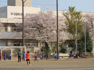 桜が満開の高田中学校にて太尾FCさんと練習試合を行いました。 5年生にとっては、初めてのフルピッチでの11人制。