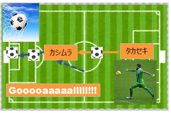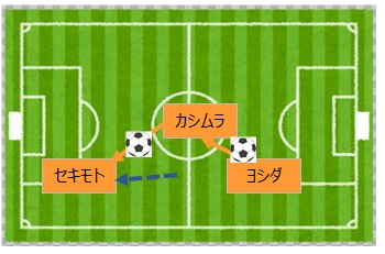 おー、ヨシダ→カシムラ→セキモトドリブル、ゴールにせまる、チャンスは作れる感じだな、良い感じだ。イメージ↓