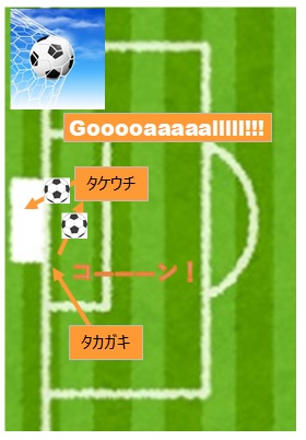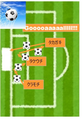 タカガキ→セキモトドリブル、ゴールにせまるも、惜しい!!!続けよう↓イメージ。