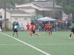 相手チームはコーナーキックに何故だかGKがゴール前まで上がってくるスタイル?コーナーキックをリョウゴウが見事セーブし、リキ⇒ヒデと速いパスを回して、タクマがドリブルで切り込み、ハーフウェイラインから無人のゴール目掛けてシュート!!!相手DFが後10㎝のところで追いついて得点ならず。惜しい!!!