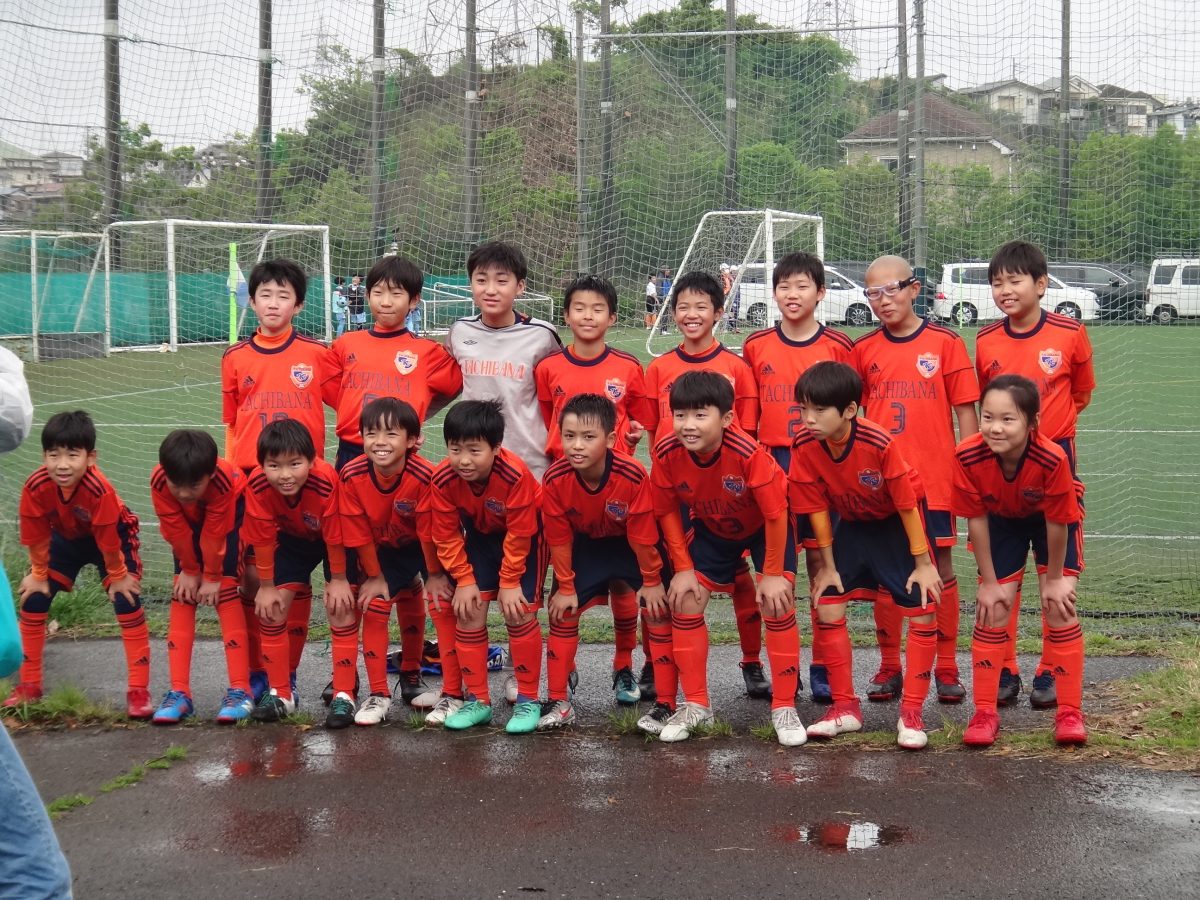 ゲーム開始からたちばなのペース。開始早々右サイドのユウトの前にボールが展開しゴール前にクロスボールが入るが、惜しくもゴールにならず。最終ラインのDF陣の連携が良く、危ない場面も少ない展開でしたが、相手の当たりも強く五分五分の状況。ゴール前へのスルーパスもあと一歩タイミングが合わない場面が多かったのですが、前半13分、ゴール前の飛び出したトモハルがフリーでボールを受け、ゴール左のコースを狙ってシューーーート、、、カーンという音とともに、惜しくもゴール左のポストに弾かれ得点にならず。応援ママたち、コーチたちから、ため息や悲鳴が聞こえた1分後、このまま前半終了になるかと思われた前半14分、左サイドに展開したケイトにボールが渡り、そのままゴール前に切り込みシューーーート!!ゴールキーパーの頭上を越えたボールは、ゴール右上のサイドネットを揺らし、豪快な先制点を決めました!!!平成最後のたちばな公式戦ゴール!!角度の無いところから決めた、素晴らしいゴールでした!!!
