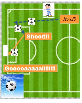 ゲームの方は、何度かカシワギのセーブ?で救われた場面もあったけど、2点先制され、あちゃ、やばい、1点位取りたいな、と思ってた所、カシムラがドリブルで駆け上がり、得点。振り返ってみよう↓、右サイドを自陣からドリブルでゴールライン付近まで駆け上がり、切り返し、そこで、相手を置き去りにして、センターリングを選択するのではなく、左足でシュート!!!ゴーーールーーー!!!!素晴らしい!!!