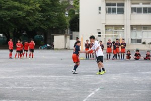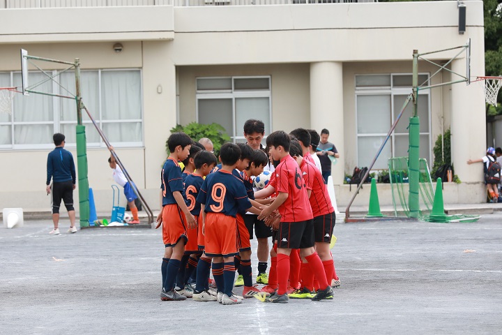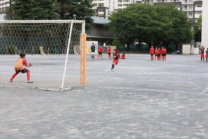 今日のテーマも「フォロー&カバー」・「早い攻守の切替」。試合前にスルーパスの練習をやったせいか、相手の動くスピードに合わせて優しいパスが出せました。「取られても取り返す」意識が定着してきて数的に有利なシーンが多く、危なげない試合展開。トモハル、ユウトはバイタルエリアからロングシュートも打てており、リラックスした様子。5得点の内、4得点は相手のボールを奪った直後のカウンターでのドリブルシュート。チームの得意パターン?が見えてきたかな?