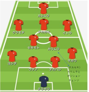 後半も4-2-3-1、タカセキとハーフタイム前に話して、タカセキをボランチに最終的にする感じ(サガワと交代も、そこの場所にカワムラ(相手上手いがカワムラなら大丈夫だろうという期待、実際期待に応えてくれた)が入るイメージ)。