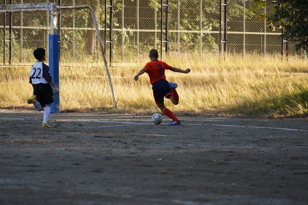 暖かい秋の日差しの中、三ツ池公園にて港北区大会3日目が行われました。相手は同じオレンジ色のユニホームを着ている大曽根SCさん。試合前のキャプテン同士のじゃんけんで勝利し、今回はホームユニホームをゲット!お、何か良い予感。グランドに向かう選手たちも、いつもより集中していた雰囲気の中、大曽根SCさんのキックオフで試合が始まりました。