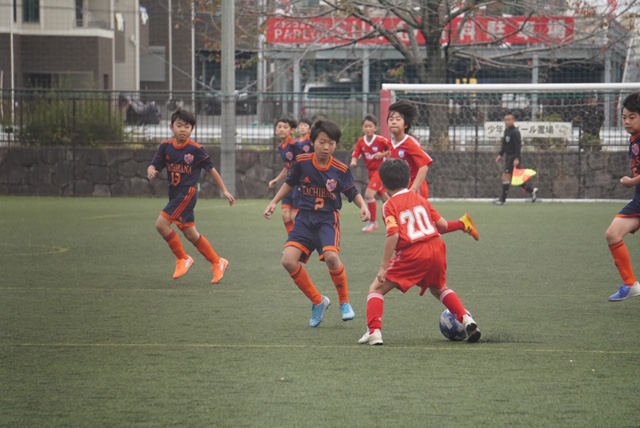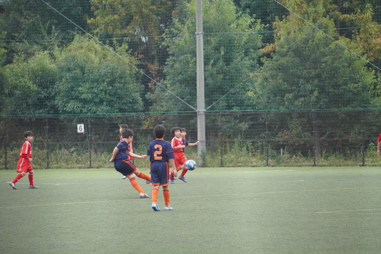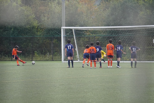 この試合は一転して序盤から押し込まれるシーンが目立った。相手がトライアングルを作って、鋭いドリブルで崩しに来るのをソウスケ、ショウタがギリギリでクリアしてなんとかピンチを脱出。たちばなも時折前線のタイガをめがけたパスからカウンターのチャンスをつくる。そこから得たFK、かなり距離があるかなと思ったが、ショウキが直接決め先制点をゲット。
