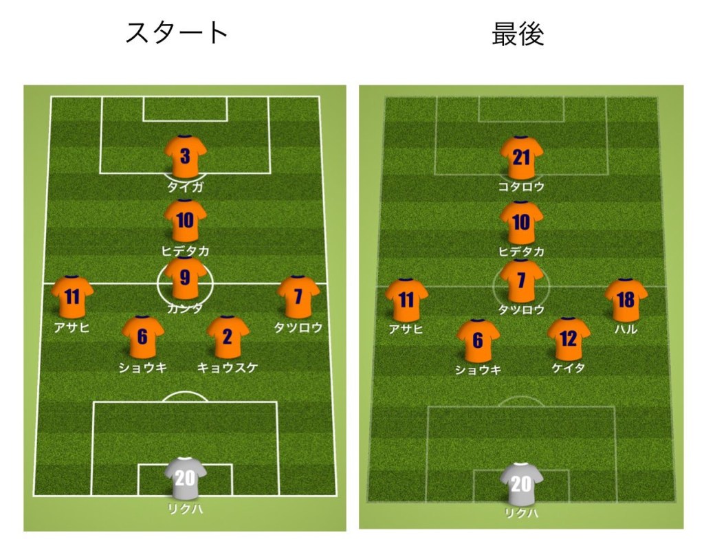 途中、カンタとケイタが代わってCBに入って、ショウキがボランチ。キョウスケとハルが交代でタツロウがボランチ、ショウキが再びCBに。という感じです。