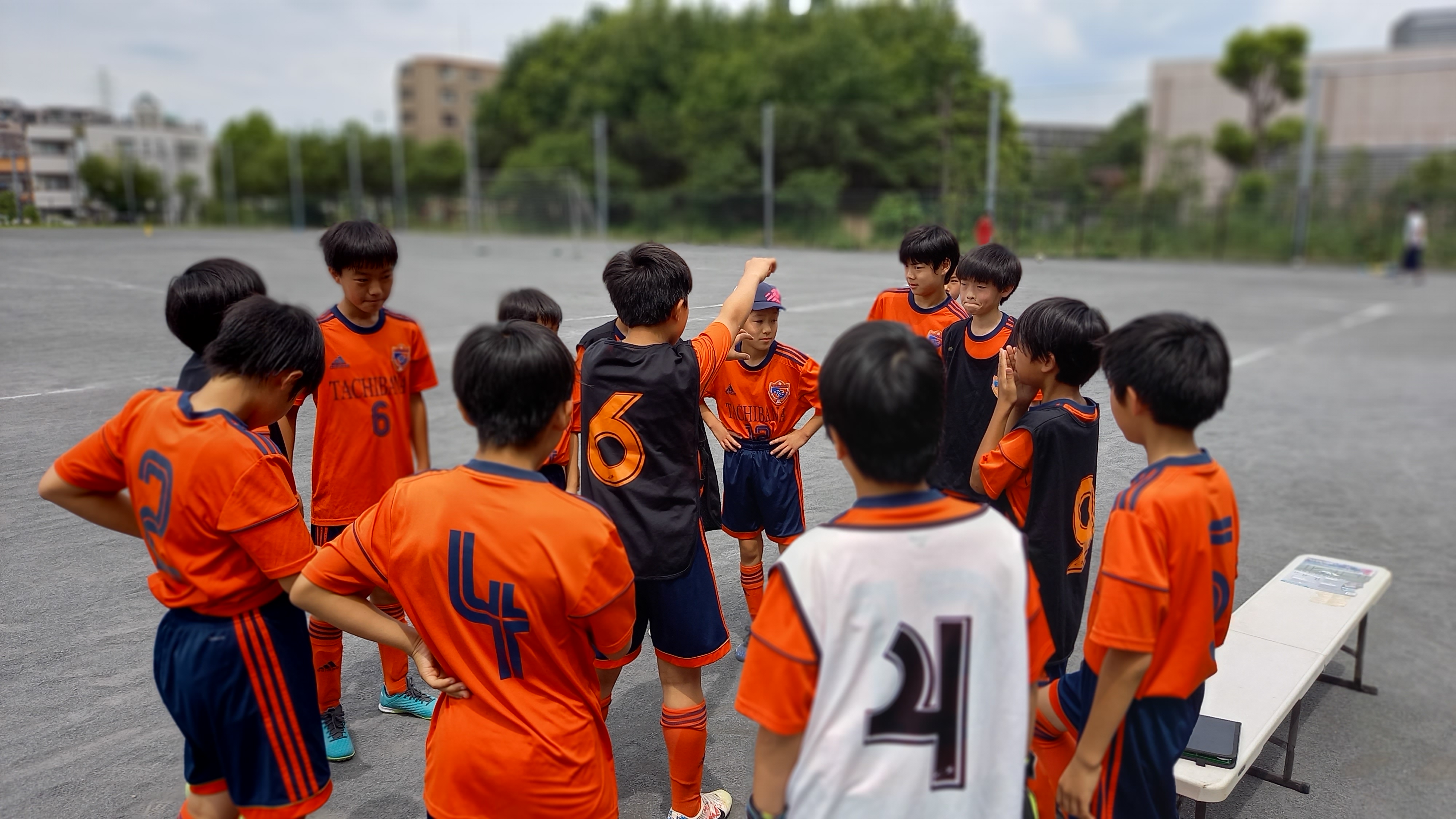 公式戦は、結構一進一退。特に前半は、ショウタのポジションや選手間の距離感がいまいちで劣勢。後半は、タイガを中心にプレスが効き始めて、たちばなペース。ハルからのスルーパスにタイガが抜け出してGKと1on1になりましたがシュートはバーのはるか上。これが一番おしいシーンだったかな。