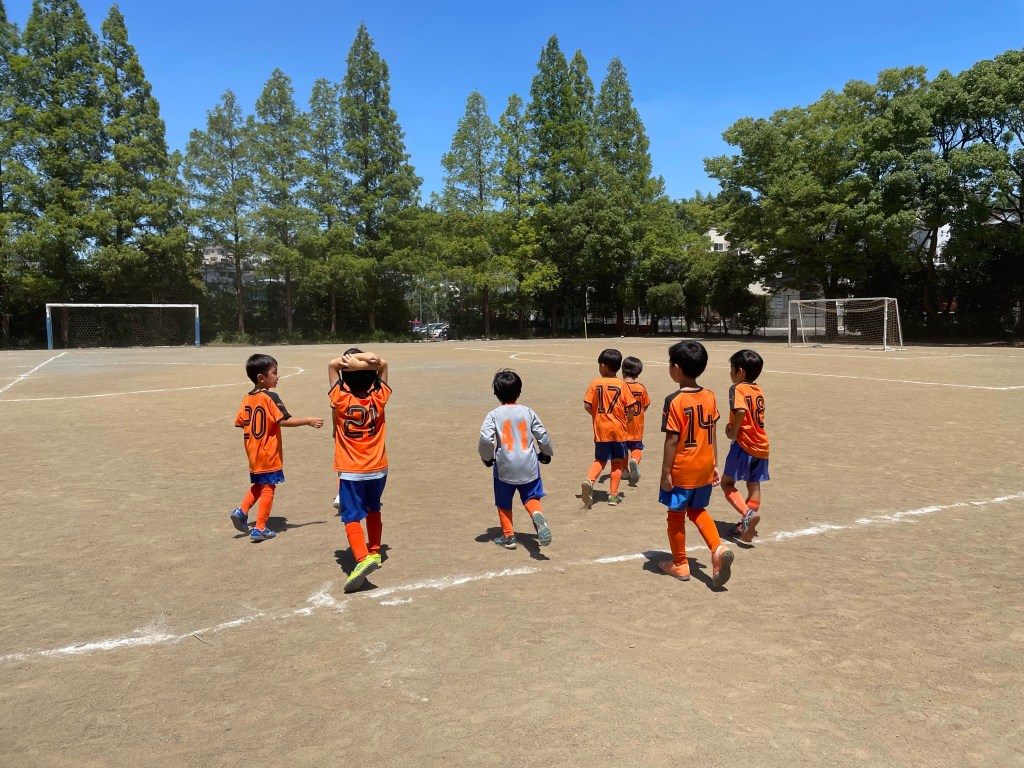 さて今日の試合ですが、市大会の最終日と日程が被ってしまった為、1年生9名(ミユ、ハル、マサヒロ、タイセイ、ヨウ、コウタ、ケンゾウ、アヤト、レネー)だけでの参戦となりました。試合は8人制10分ハーフ。1、2年混合の太尾FCさんと港北FCさんとの2試合。この暑い中、1年生だけで走り切れるか心配でしたが、みんなよく頑張ってプレー出来ました。試合前コーチから、いつも練習で言われている「攻める時」「守る時」にやってほしいことのおさらいと、失敗してもいいからチャレンジしてほしい、そしてチャレンジした結果の仲間のミスを責めてはいけないという話しがあり、みんなが「ハイっ」と元気よく返事が出来たところで試合開始。