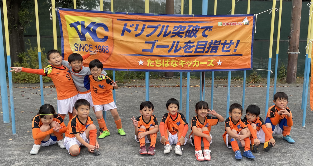 GKには定評のあるタイチ。DFにアラタとハヤタ。試合前ミーティングでは、福富コーチからのアドバイスとゆかりコーチからの気合入れがあり、みずきSCさんのKOで試合開始。開始2分でイブキがファーストシュートを打つと、前半はたちばなの攻める時間が多く、果敢に攻めていたサエのシュートや、直接ゴールを狙える位置でのイブキのフリーキックも、惜しくも相手キーパーにはばかれ前半終了。後半は相手にコーナーキックをたて続けに3本もとられたり、ゴール前サイドに運ばれたボールにみんな寄って行ってしまい、ぽっかり空いたゴール前からシュートを打たれたり(これはタイチが懸命に足をのばしスーパーセーブ。お見事!)、攻められるシーンが多かった中、後半開始5分、諦めずにアタックし続けていたサエに待望のゴールが生まれました。両手を上にあげて満面の笑みをみせるサエちゃん。今大会ではここまでチーム得点ゼロだったので、みんなも大喜び。勢いにのって追加点がほしかったところでしたが、タイチが相手の至近距離からのシュートを一度は顔面ではじいたものの、こぼれ球をすぐに蹴りこまれてしまい失点。お互いまだ勝ち点がありませんでしたが、最後は仲良く引き分けで終わりました。