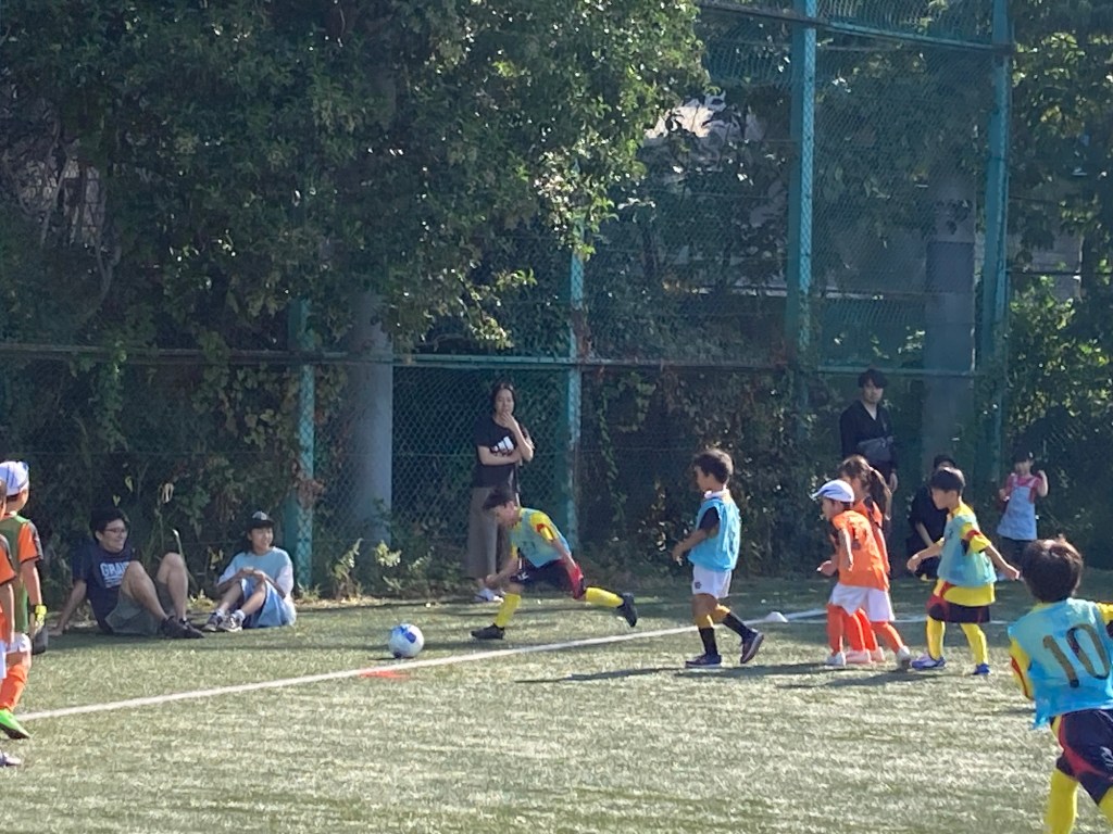 今日はご近所の慶應下田グラウンドで活動している慶應SSさんにお招きいただきまして交流試合をさせていただきました。いつもは下田小学校の土・砂のグラウンドですが、人工芝のきれいなピッチで、秋晴れもあって気持ちいいのか寝転んでいる子供もいましたが😅、子供たちがどんなプレーを見せてくれるのか楽しみです。