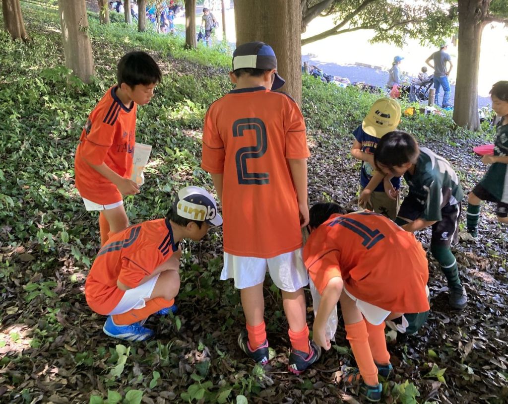 荷物置き場で日陰を求めて木々が生い茂る場所に陣取ったところ、木の根元で昆虫を探し始める子供たち。クワガタが見つかり大盛り上がりの子供たち。他チームの子供たちも集まってますます昆虫探しに夢中。あと30分で試合始まるんですけど・・・。試合はどうなることか一抹の不安がよぎります。