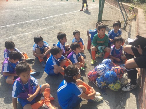 リョウマは「ジャンボが上手く蹴れないし、キーパーは自身がない」と言いながら、緑のキーパージャージにお着替え。「袖が長いし、グローブも臭い・・・」とブツブツ。そして試合開始。なるほど。リョウマはパントキックの際、一度自分の前でボール放して少し弾ませてから蹴っていました。ただ相手によってはゴールキーパーがボールを放した瞬間に素早く寄ってくるので大ピンチにつながる恐れあり。リョウマが何回かそれをやった後、オウスケがリョウマに「ボールはバウンドさせないで蹴って」とやさしくアドバイス。コーチ達がいつも言っている「試合中、お互い声を掛け合おう」が出来ている☆彡 そしてこの試合で本当に光っていたのがオウスケのドリブル。この予選ブロックを5勝1分で優勝した太尾FCのコーチも「たちばなさんの10番はボールタッチが上手い」と言っていましたよ。アムゼルさんとの試合でも多く見られたことですが、目の前にいる選手に向かってボールを蹴ってしまう選手がまだ多いこと。でも圧倒的に負けている感じはなく、あともう一歩だよね。練習で個のスキルも上げていきましょう。ふざけてしまって試合の出場時間が短くなってしまった子は、ピッチに出た瞬間から気持ちの入ったプレーが出せる準備が出来るようにしていこうね。