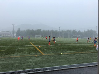 突然の大雨により、スポーツテストが始められませんでした。 子ども達はしばらく雨の中、走り回っていましたが、雷も鳴ったのでコーチストップ。 スポーツテストは夜に延期します。