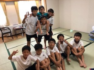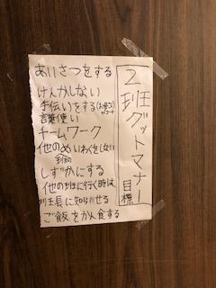 絶対優勝を狙う2班。試合だけでなくグッドマナーでも負けないぞ! ただし、外の廊下に向かって貼ってあるあたりが、自分達向けでなく、判定する人へのアピールですね(笑)。