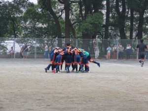 開始早々、ショートコーナーを使ったチャンスが訪れるもゴールならず。中盤のせめぎ合いが続いた後半13分。相手チームにバイタル右から、ミドルシュートを打たれ、やばい!!!運良く、ボールはクロスバー右に当たり、跳ね返ったボールがフウマの前に転がったところを、おしゃれなヒールキックで更に前線にクリア。そのボールがゴール正面に抜け出したトモハルに渡り、キーパーと1対1になったところを、冷静にゴール右にシュート!!キーパー反応できず、ゴ~ル!!!そのままベンチ前も戻ってきたところを、ベンチメンバー、コーチとハイタッチ!イエ~~イ!!!更に終了間際に、トモハルの左コーナーキックをキーパーがハンブルしてボールがゴールを割り得点!3点目を上げたところで、試合終了となりました。ニコのミドルシュートやユウトのペナルティエリア内で受けたファールなど、ベンチがざわつくプレーもありましたが、2連勝で最終日を終えました!!さあ来週から合宿がスタート!この調子で合宿の対抗戦も盛り上がって行こう!!!