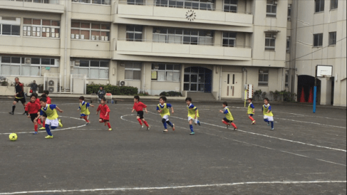 本日は、試合の参加者が幼稚園年長、新一年生、新二年生の計17人と多かったので、背番号順の2番から①と②という形式で2チームに分けて、チームごとに10分ハーフ6本を、3本ずつ参加するように、出来るだけ参加選手が試合に均等にでられようにしました。